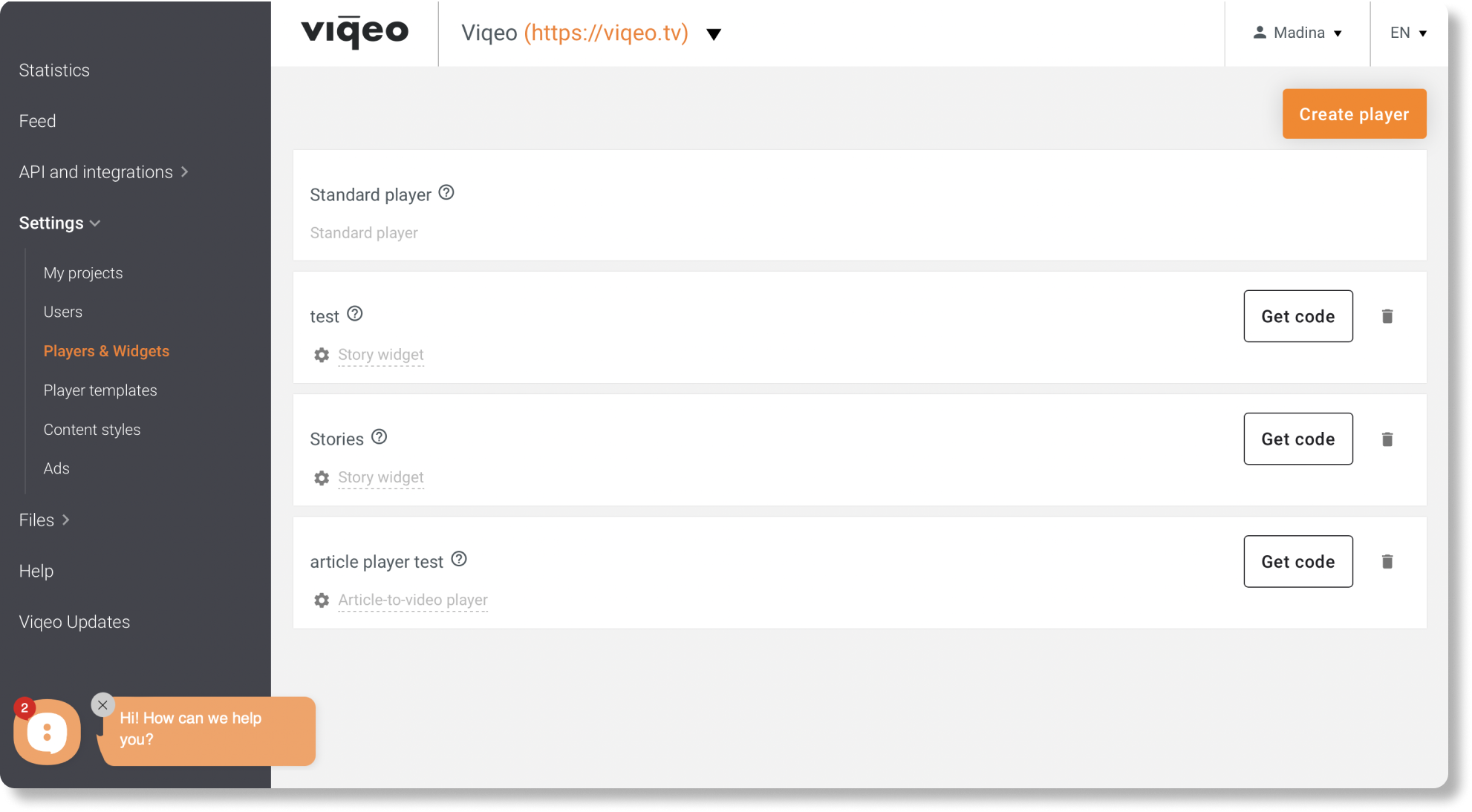 After logging in to your Viqeo account, go to Players & Widgets settings under the Settings in the Sidebar menu.